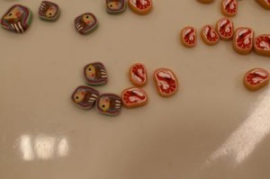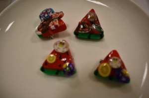 好きなものを3つ選び、スイカのブローチに貼りつけ、つやつやのコーティングをしました。